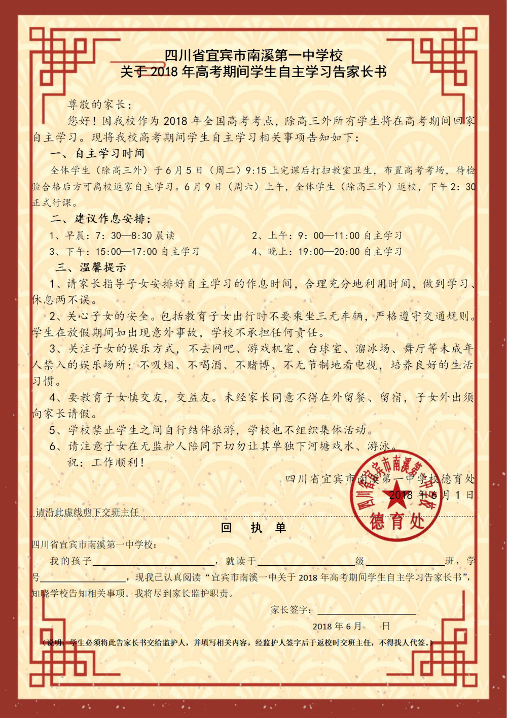 2018高考期間學(xué)生(高三除外)回家自主復(fù)習(xí)告家長(zhǎng)書