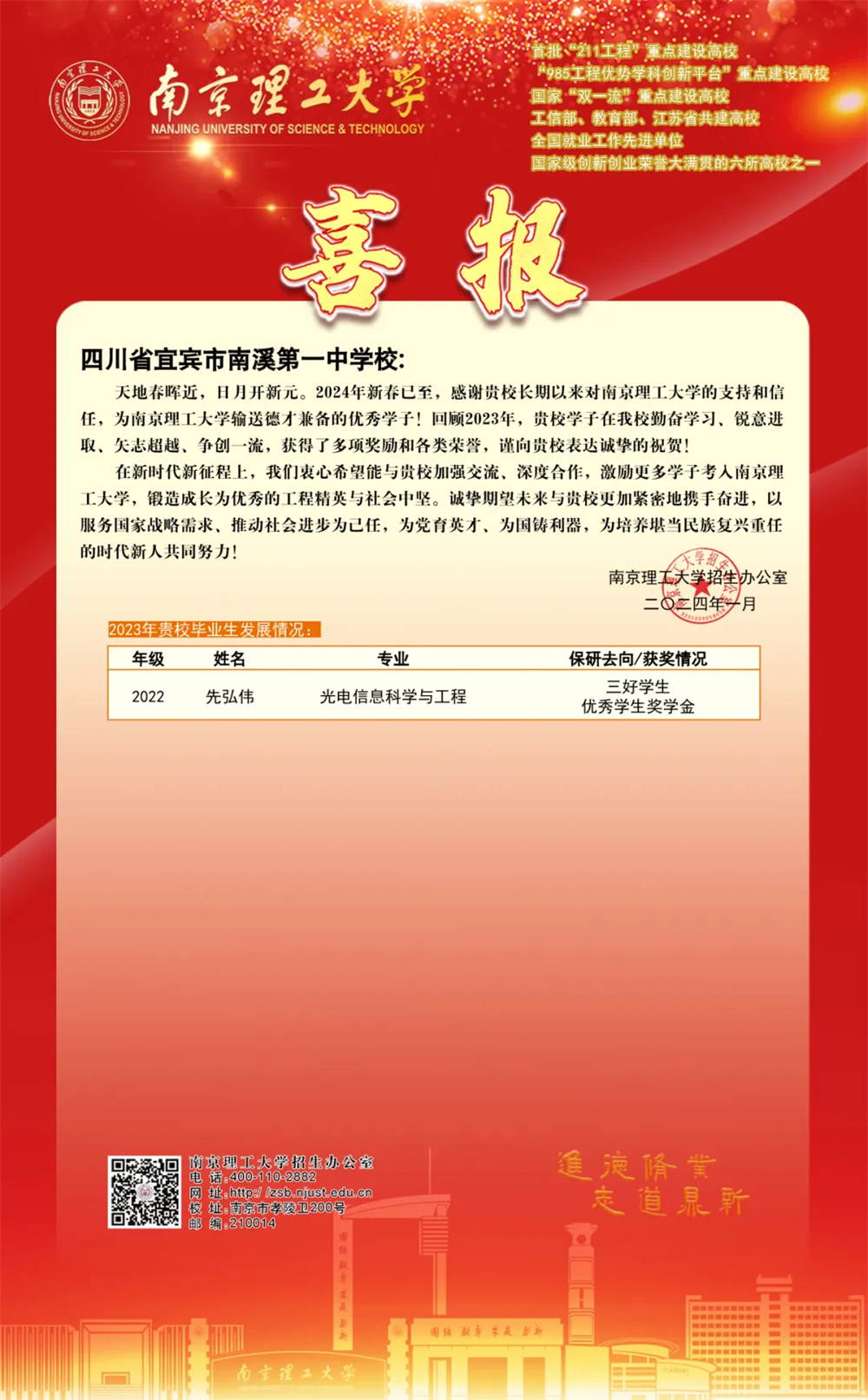 (曾薪蓉) 近日,南京理工大學向宜賓市南溪一中發(fā)來喜報,祝賀學校優(yōu)秀畢業(yè)生先弘偉在大學就讀期間,矢志超越、爭創(chuàng)一流,獲得“三好學生”和“優(yōu)秀學生獎學金”,期待與宜賓市南溪一中進一步加強合作,為黨育英才、為國鑄利器,為培養(yǎng)堪當民族復興重任的時代新人共同努力。