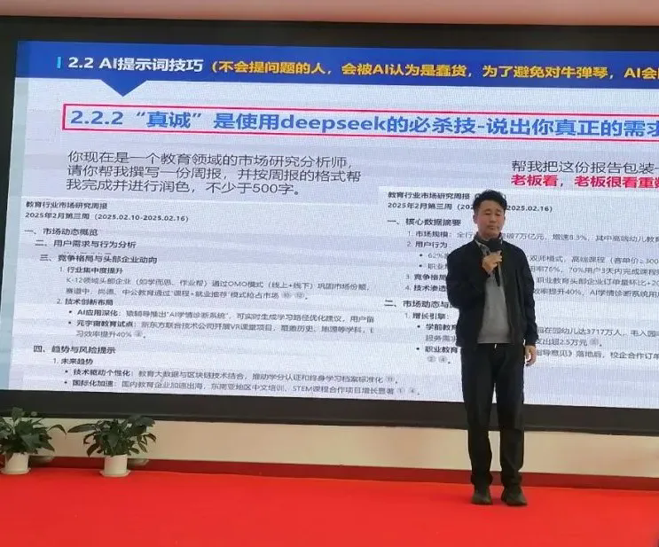 教育技術(shù)博士于天貞老師以“AI在教育中的極簡應(yīng)用”為題,為班主任們打開了人工智能技術(shù)在教育領(lǐng)域應(yīng)用的新視野。于博士用通俗易懂的語言,介紹了人工智能技術(shù)在各領(lǐng)域的應(yīng)用情況,并結(jié)合實(shí)際案例,演示了如何利用AI技術(shù)進(jìn)行學(xué)情分析、教學(xué)設(shè)計(jì)、PPT制作和個性化教學(xué)等。于博士強(qiáng)調(diào),AI技術(shù)并非要取代教師,而是作為教師的得力助手,幫助教師更好地了解學(xué)生、優(yōu)化教學(xué),最終實(shí)現(xiàn)因材施教。