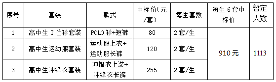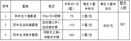 6.校服款式:《宜賓市中小學(xué)校服目錄(試用版)》“方案四”所列款式:高、初中生體恤衫套裝、高初中生運(yùn)動服套裝、高初中生沖鋒衣套裝。