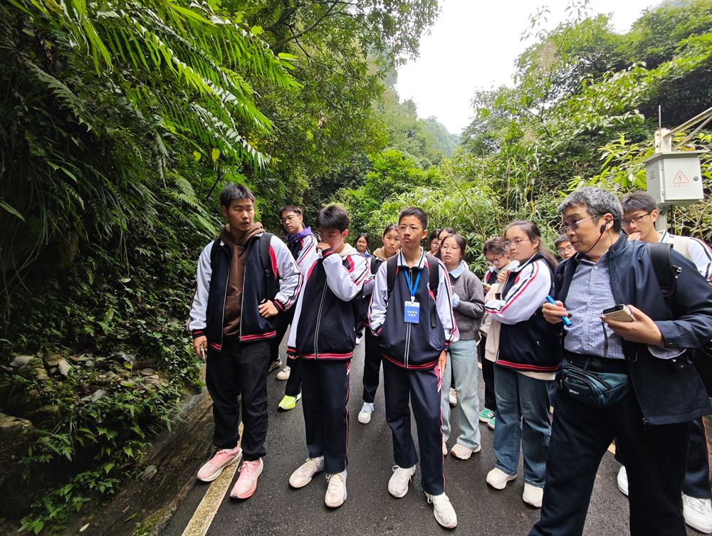 科考首日,同學(xué)們乘車前往峨眉山市四溪溝景區(qū)。在這里,教科書上的“喀斯特地貌”變得觸手可及。在侯教授和田教授的細(xì)心講解下,同學(xué)們對(duì)照巖層紋理,判斷碳酸鹽巖的沉積年代與環(huán)境,并深入溶洞,實(shí)地探究喀斯特地貌的特征與成因。洞內(nèi)形態(tài)各異的石鐘乳、石筍,不僅是自然奇觀,更是記錄地殼變動(dòng)與水流侵蝕的“地下史書”。