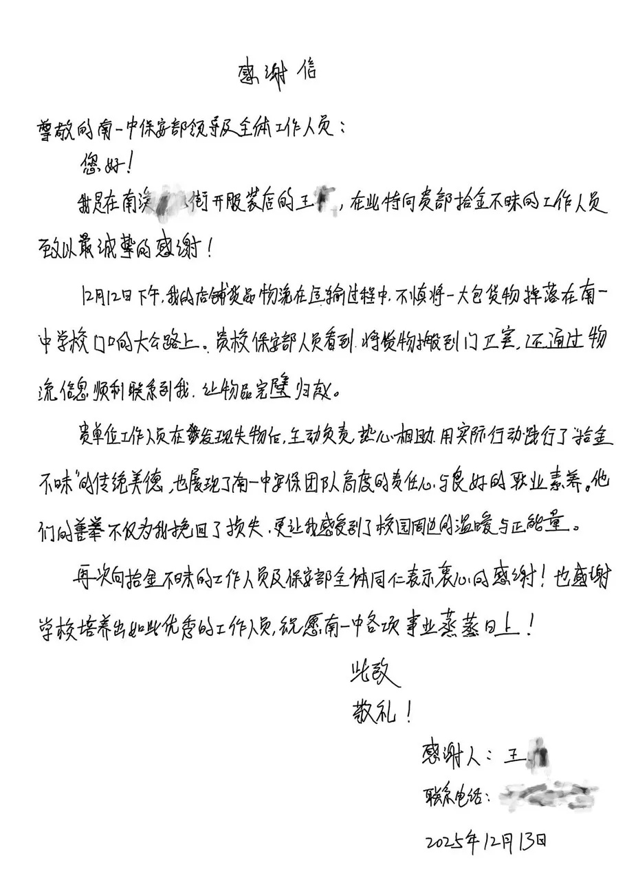 近日,一封情真意切的感謝信送達南溪一中安保處,字里行間滿載著服裝店經(jīng)營者王女士的誠摯謝意與深深感動。信中講述了南溪一中安保人員在校園周邊拾獲其貨物并主動歸還的暖心事跡,展現(xiàn)了南溪一中安保團隊恪盡職守、樂于助人的優(yōu)良風(fēng)貌。